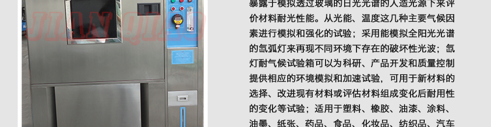 用途:氙燈老化試驗箱,氙燈耐候試驗箱,氙燈光老化試驗機是一種綜合氣候試驗裝置,除進行氣候老化試驗外還可進行高分材料的耐光性的測試,即高分子材料暴露于模擬透過玻璃的日光光譜的